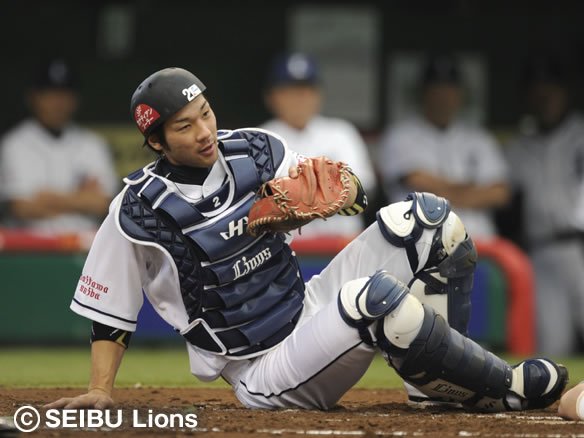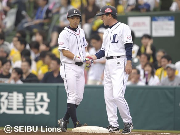2番 栗山 空三振 1-2からの外角低めのストレート時に1塁ランナー・熊代がスタート。キャッチャーからの送球を受けてタッチしにいったショートのグラブからボールがこぼれ、盗塁成功! 熊代にプロ初盗塁が記録された! |
