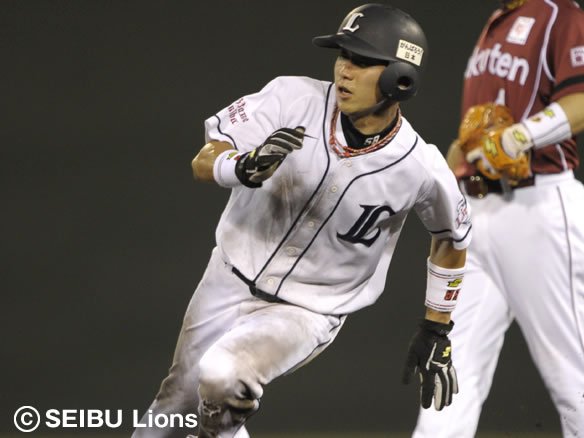 1番 浅村 左安 2-2からファウルで粘った後の9球目、外角高めのストレートを引っ張ると、打球はショートの横を抜けてレフトの前へ! 1塁ランナーは2塁を回っても減速せず、さらに加速して3塁を陥れた! |