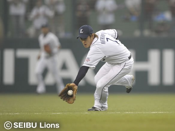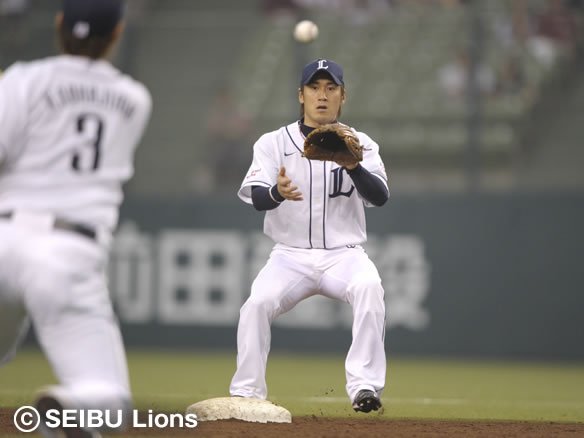 6番 高須 二ゴ失 1-2から外角へのストレートを打ち返されたゴロは二遊間へ転がるも、素早く回り込んだセカンド・片岡が逆シングルでつかむと、すぐさま振り返って1塁へ送球! 正確な送球をするも、ファーストがミットに収めることができずこぼしてしまった。記録はファーストのエラー。 |