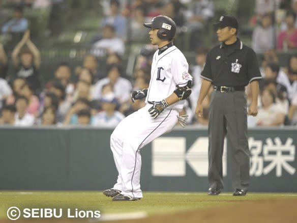 2番 聖澤 右中二 初球、真ん中に入るスライダーを振り抜かれた大きな打球は、ライト寄りに下がるセンターの横で弾みフェンスに到達。打った聖澤は2塁へ。 |