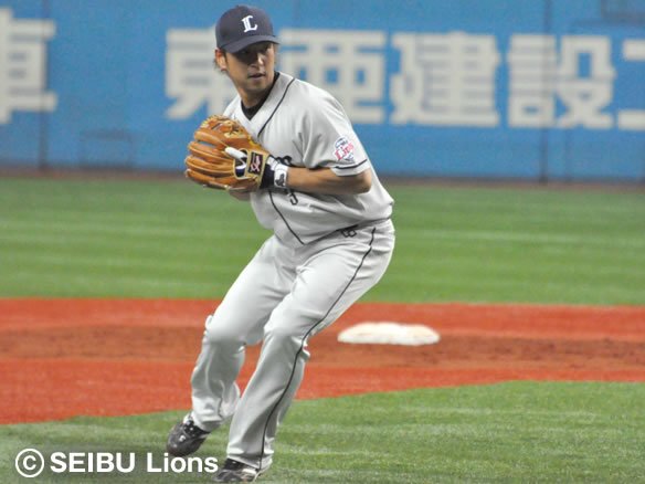 投手 西口 3番 後藤 二ゴ 初球、外角のチェンジアップを振り抜かれた打球は、二遊間近くに転がったがセカンド・片岡が逆シングルで捕球。素早く1塁へジャンピングスロー! ナイスプレー! |