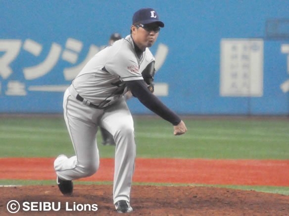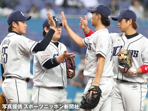 9回のマウンドを任された3番手・牧田は得点圏に走者を背負いましたが、最後は大引をライトフライに打ち取り試合終了! 先発・西口が6回無失点の好投を見せると、中島、中村が一発攻勢と投打がかみ合う試合展開で勝利しました! |
