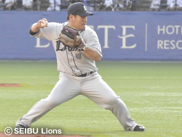 投手 帆足 1番 岡田 二ゴ 2-1から外角のパームを引っ掛けさせ、ボテボテの当たりとなった打球はセカンドが落ち着いてさばいた。 |