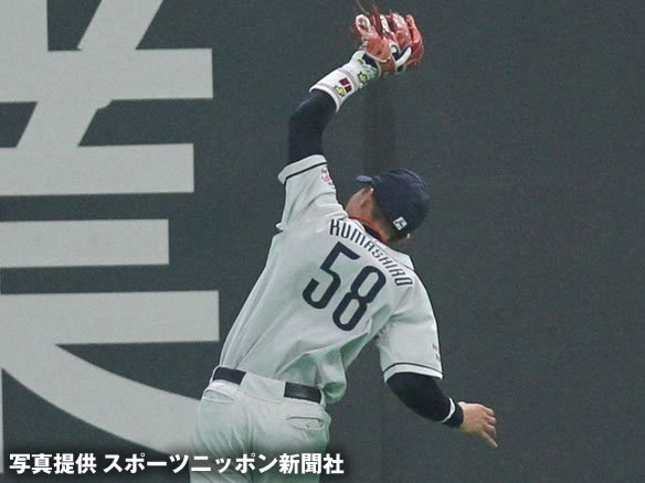 投手 岸 1番 陽 左飛 1-0から内角のストレートを強振され、打球は大きな当たりとなって飛んでいったが、背走するレフト・坂田がグラブを伸ばしてキャッチ! |
