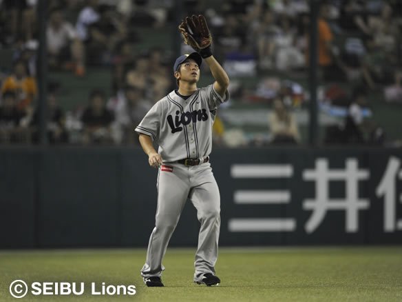 投手 帆足 5番 今江 中飛 0-1から真ん中低めのパームボールを打ち返されたライナー性の打球は、センターの前方へ。しかし、センター・栗山が素早く身を寄せて、地面スレスレのところで捕球!! |