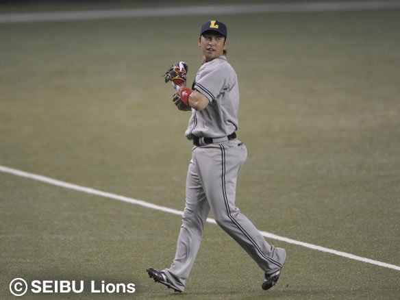 パームボールが制球良く決まってこの回は3者凡退に仕留めた帆足。5月29日以来、約2ヶ月ぶりとなる5勝目の権利を手にして、ベンチへと引き上げます!! |