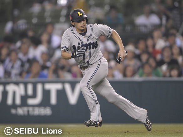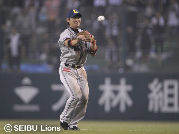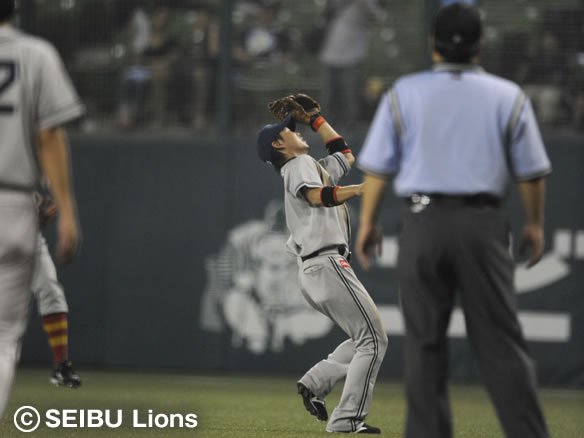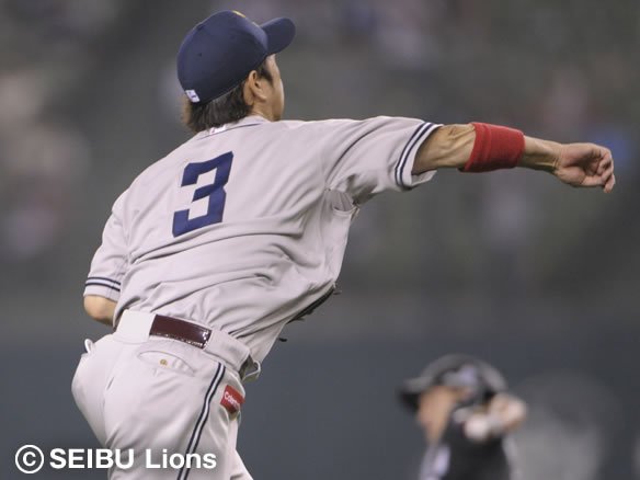 7番 里崎 右安 1-2から外角のストレートをおっつけられ、打球は一二塁間を破ってライト前へ。1塁ランナーが2塁を蹴ったのを見てライト・秋山は3塁へ矢のような送球を見せる。クロスプレーとなったが秋山の好返球が勝りアウト! |