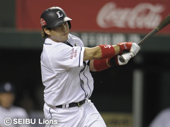 投手 杉内 3番 中島 右翼二 1-0から外角のチェンジアップを逆らわずにおっつけ、打球は追い掛けるライトの右に落ちフェンスへ到達。打った中島は悠々と2塁へ! |