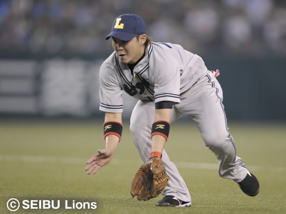 投手 菊池 5番 稲葉 左翼二 1-2から外角へのストレートを流し打ちされ強いゴロとなる。打球はサードが逆シングルでつかもうとするがグラブをはじいて後方へ転がっていった。レフトが打球を拾いにいく間に、稲葉は2塁へ進む。 |