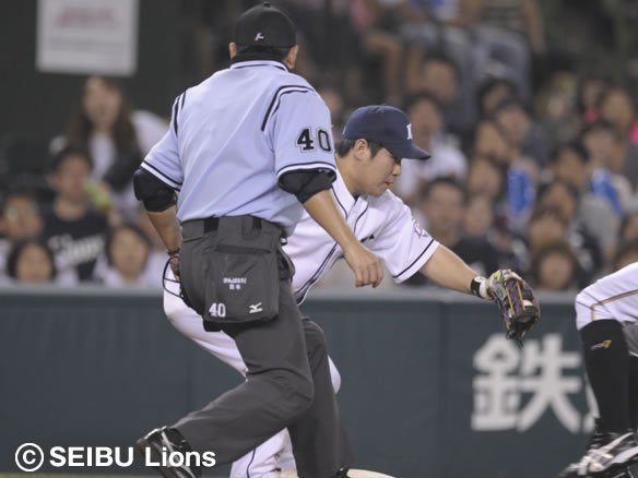 投手 帆足 5番 稲葉 一ゴ 2-2からの8球目、パームを引っ張られると打球は強い勢いで1塁線に飛んだが、ファーストが体の正面でガッチリと捕球。 |