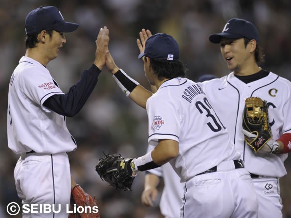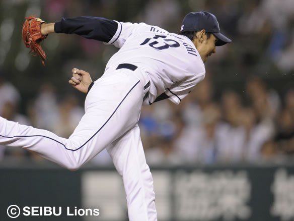 今季初となる9回のマウンドに上がった西口はスケールズ、陽から連続三振を奪うと、最後は糸井をショートゴロに仕留めて1対0で試合終了! 虎の子の1点を守り抜いた西口は2005年以来、約6年ぶりとなる完封勝利で今季6勝目を挙げました! |