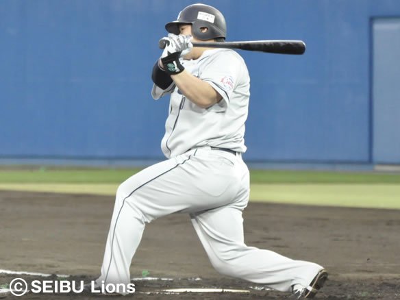1番 栗山 一犠 0-1から、送りバントを敢行、前進してきたファーストの前へ巧みにボールを転がすと、打球が処理される間に各ランナーが進塁。送りバント成功! |