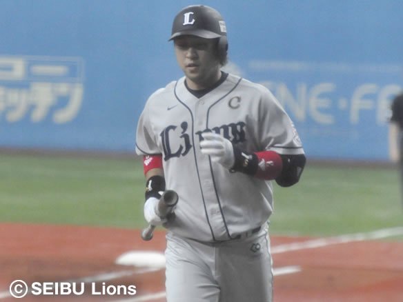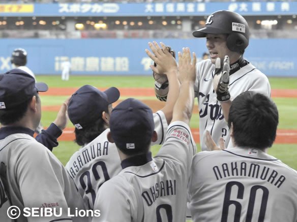 銀仁朗がヒットを放ち得点の足掛かりを作ると、片岡のタイムリーで追加点を奪いました! チャンスを確実に生かす攻撃で、着実に点差を広げる隙の無い攻撃。好投を続ける帆足には、心強い援護です! |
