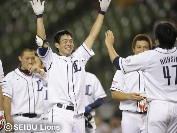 7番 秋山 中安 2-1から外角低めのシンカーをたたきつけると、高く弾む打球が前進守備を敷く二遊間を破っていった! 3塁ランナーがかえって6対5! 秋山がサヨナラ打を放って試合を決めた!! ![]() 7