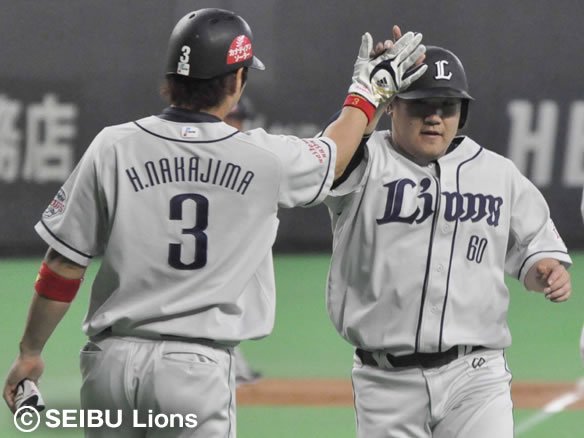 レフトを守る中田が驚いたように上空を見上げるその上を、打球が悠々と越えていく様子は、独走状態となっているパ・リーグの本塁打王争いそのもの。中村の大きな放物線で、試合を振り出しに戻しました!! |