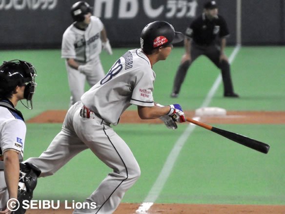 投手 武田勝 1番 栗山 右安 0-1から外角低めのカーブを引き付けてたたき、ライナー性の打球がライトの前で弾んだ! |