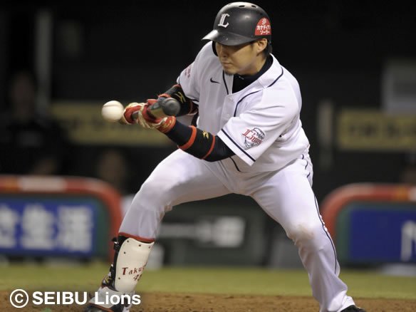 1番 栗山 一犠 2-0から高めのストレートをバントした打球は、低く上がって1塁線付近で弾む。ファーストに拾われて1塁へ送球される間に、2塁ランナーが3塁へ進んだ。送りバント成功! |