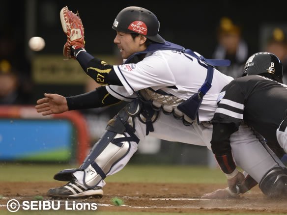 9番 細川 初球、ダブルスチールを敢行されるが、ここはキャッチャー・炭谷が冷静に3塁へ送球し、余裕を持って2塁ランナーを刺した! |
