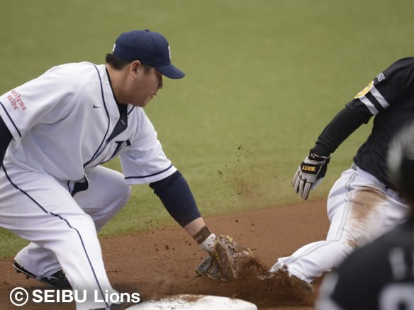 6番 長谷川 遊ゴ 2-0からヒットエンドランを仕掛けられ、低めのストレートをおっつけられる。2塁寄りに守っていたショートの逆を突かれる当たりとなるが、ショート・中島が素早く反応し逆シングルでボールをつかむと、1塁へ送球した。 |