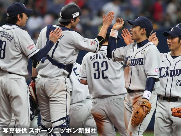 9回は岡本篤から松永へと細かくつなぎ、試合終了! 打線がつながり、今季最多得点となる8点を挙げて好投を続ける石井を援護。終盤に追い上げられるも、全員野球で逃げ切りました。これで今季初の3連勝。明日も5位・バファローズを破り、最下位脱出といきましょう!  |