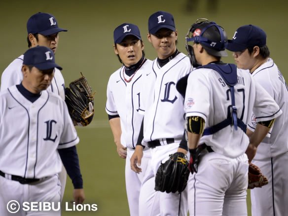 杉本投手コーチと内野陣がマウンドに集合。ピンチを背負って相手の中軸を迎えた十亀に対し、アドバイスを送ります。 |