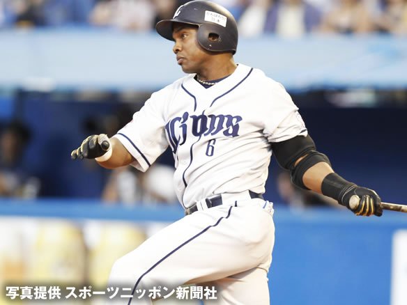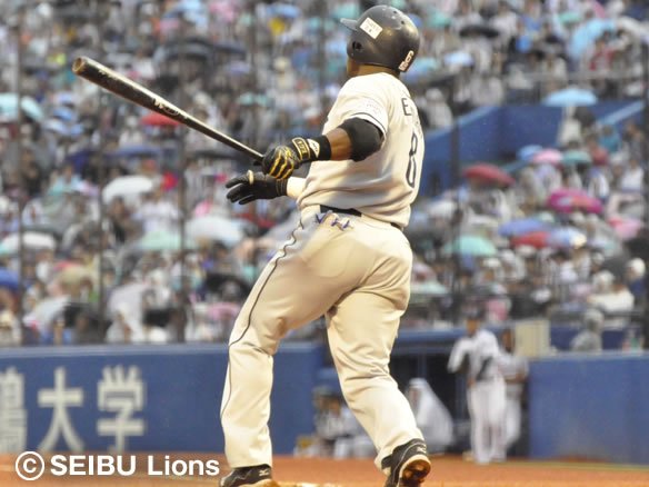 6番 ヘルマン 左安 初球、高めのストレートをたたきつけて高く弾む打球は、サードの頭上を越えてレフト前へ転がる! 1塁ランナー・秋山は一気に3塁へ滑り込んだ! |