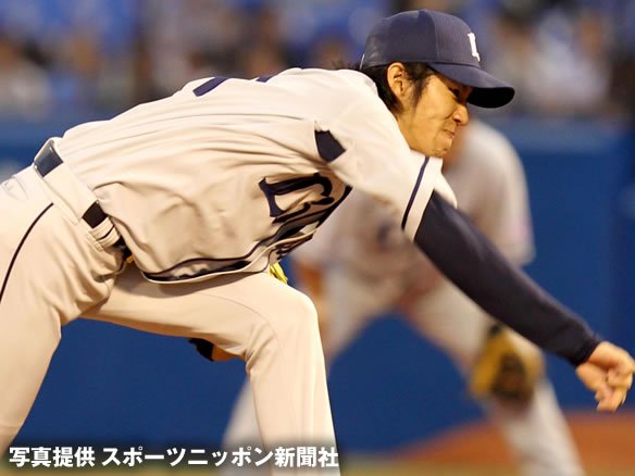 長打力のある畠山、バレンティンを外野フライに打ち取ると、この回も3人で片付けた岸。味方の援護を待ちます! |