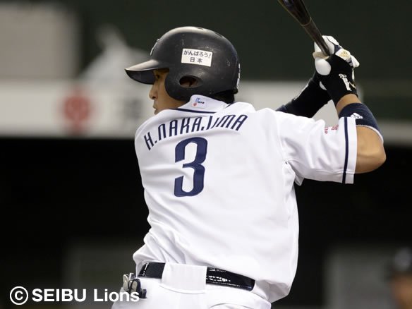 3番 中島 左安 フルカウントから高めに浮いたスライダーを引っ張ったゴロは、飛び込むサードの脇を抜けてレフト前へ転がった! 中島はこれで10試合連続ヒットを記録! |