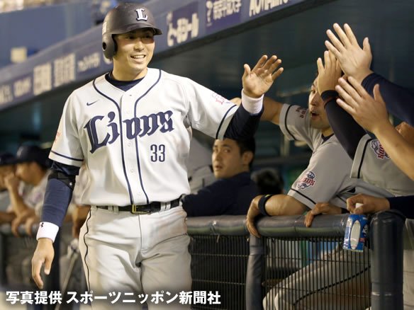 投手 唐川 2番 栗山 投安 3-1から高めのストレートを打ち返し、鋭いゴロがピッチャーを強襲する。こぼれたボールはショートに拾われて1塁へ送球されるが、打った栗山がわずかに早く1塁を駆け抜けた!  |