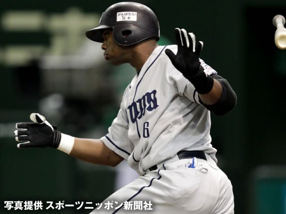 5番 カーター 中安 0-1から高めのストレートをはじき返した打球は、鋭いライナーとなりショートの頭上を越えて左中間へ飛んでいった。1塁ランナー・中島は2塁を蹴って3塁を陥れた! |