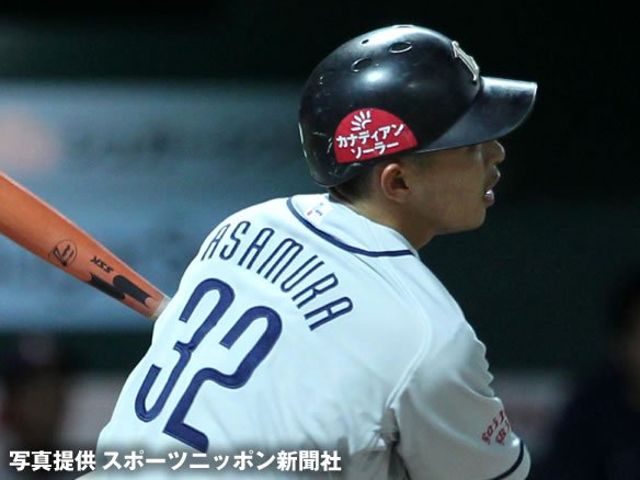 投手 大場 6番 浅村 左安 初球、内角寄り低めのスライダーに詰まらされながらも、しっかりと振り切った打球はレフトの前に落ちた! |