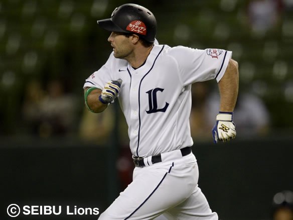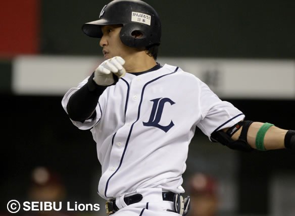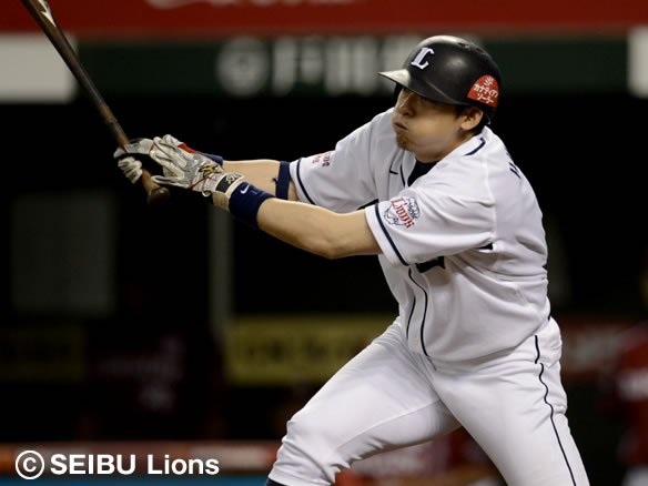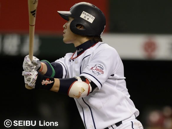 1番 栗山 中安 1-2から外角へのスライダーをバットの先で打ち返し、上がった打球が左中間の浅い所で弾んだ! |