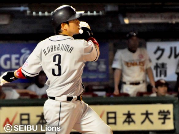3番 中島 中安 0-1から高めのスライダーに詰まるも、上がった打球はセンターの前にポトリと落ちた! 中島はこれで8試合連続ヒットを記録! 1塁ランナーは3塁へ進んだ! |