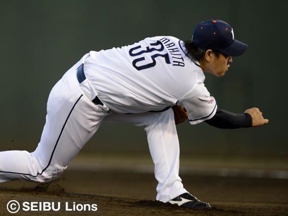 援護射撃を受け、さらにピッチが上がる牧田のピッチング。5回を投げ終え、6つの三振を奪っています! |