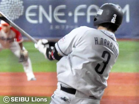 3番 中島 中安 初球、内角寄りのストレートをおっつけ、ライナー性の打球がジャンピングキャッチを試みるセカンドの上を越えた! |