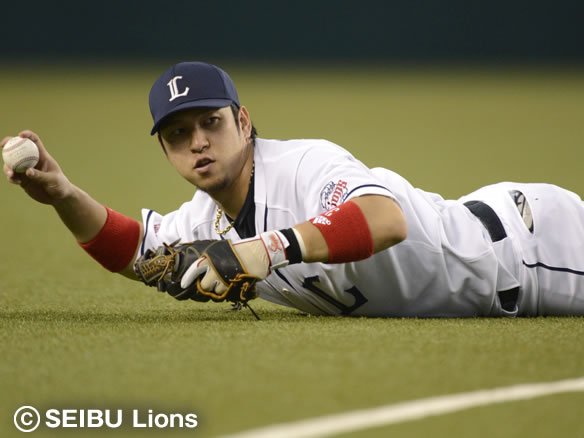 投手 石井 6番 サブロー 遊直 1-0から外角高めのストレートを引っ張られるが、三遊間へのライナーは3試合ぶりの出場となっているショート・中島がダイビングキャッチした! |
