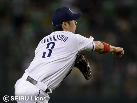 3番 中島 センタータイムリー2ベースヒット! 1-2から低めに沈むフォークを軽いスイングですくい上げると、伸びのある飛球が後退してジャンピングキャッチを試みるセンターのわずかに上を越えていった! 3塁ランナーが生還し2対0。打った中島は2塁へ到達し、自身12試合連続ヒットを記録! ![]() 3
