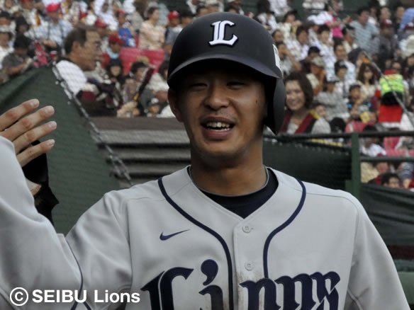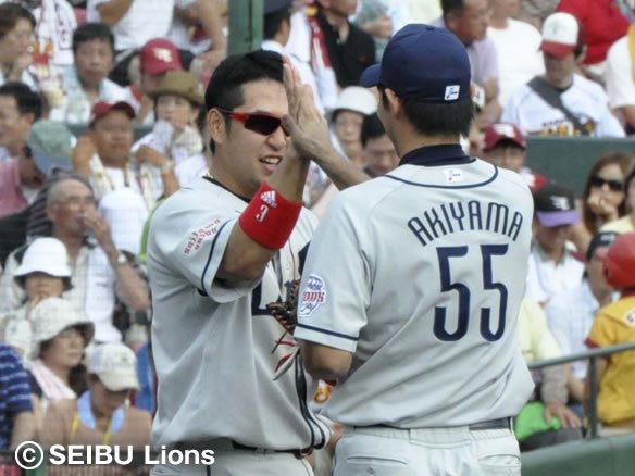 中島の適時打で生還した秋山が歓喜のハイタッチ!