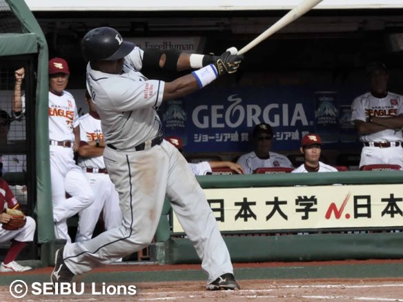 5番 カーター 左翼二 1-1から外角へのストレートを反対方向へはじき返し、鋭い打球が3塁線を破った! 1塁ランナーは3塁へ進み、打ったカーターは2塁へ到達! |