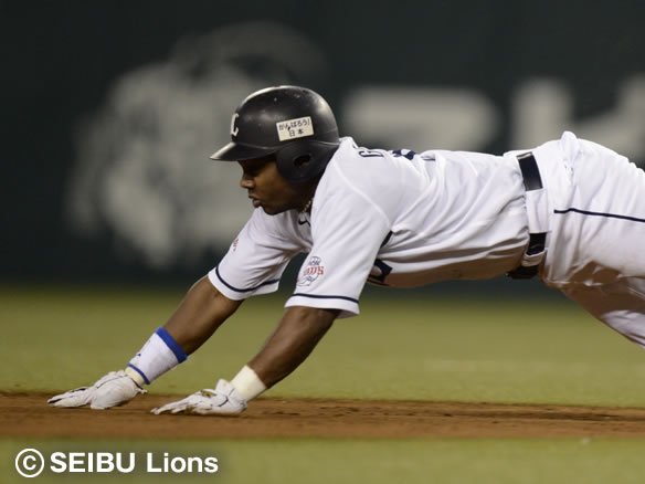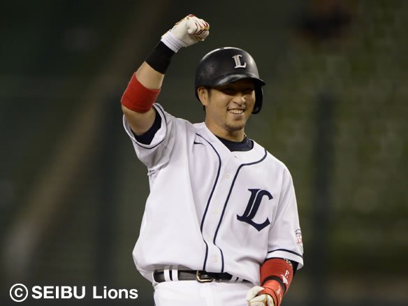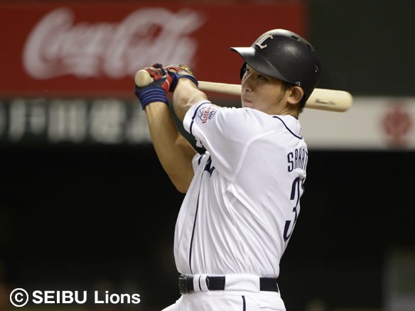 2番 秋山 レフトフライ 3-1から外角高めのストレートをはじき返すが、上がった打球はレフトにセンター寄りで捕球される。これを見た2塁ランナー・浅村は果敢にもタッチアップで3塁を狙い、返球よりも早く滑り込んだ!  |
