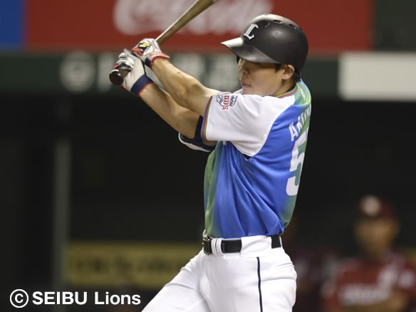 2番 秋山 左安 0-2から高めのストレートをたたくと、鋭いライナーがレフトで弾む! 秋山はこれで13試合連続ヒットを記録! |