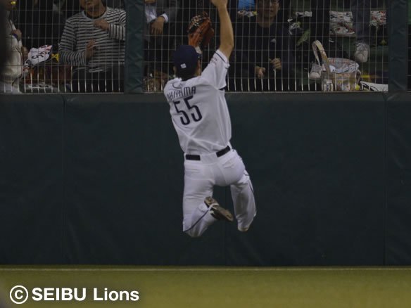 5番 小久保 中飛 1-2から外角へのストレートを捉えられ、大飛球がセンターの後方を襲う。しかし、センター・秋山がホームに背を向けて激走すると、腕を目いっぱい伸ばしながら滑り込んで捕球! 足からフェンスに激突するも、グラブからボールを離さなかった! 秋山の気迫の守備に、スタンドからは割れんばかりの拍手が送られる!  |