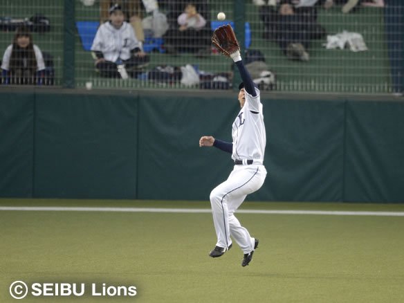 オープン戦途中から外野の守備にも就いている金子。大きな飛球に反応良く飛びつくファインプレーを見せました! 守りでもベンチの期待に応え、開幕スタメンを強く引き寄せています! |