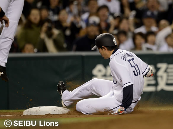 秋山が3塁に滑り込み先制のチャンスを作る!