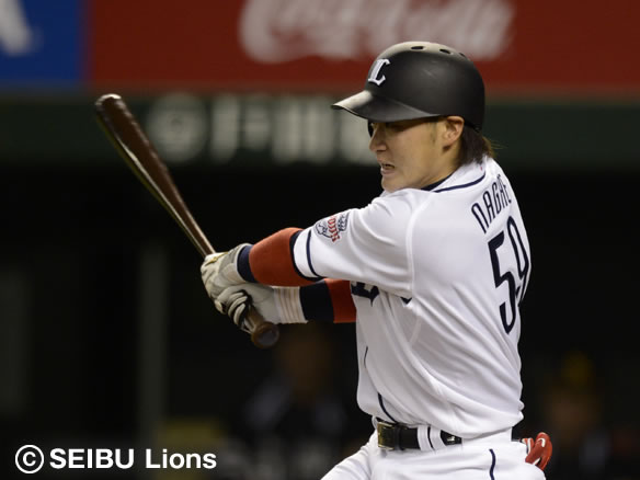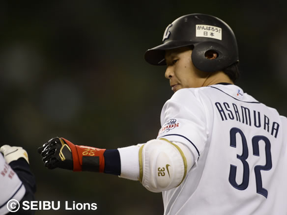 6番 浅村 右中三 ランナー1,2塁の0-1からライトへの勝ち越しタイムリースリーベース! 西3-1ソ 3塁 ![]() 3