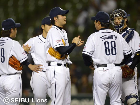 炭谷はマウンドに駆け寄り涌井に声を掛ける
