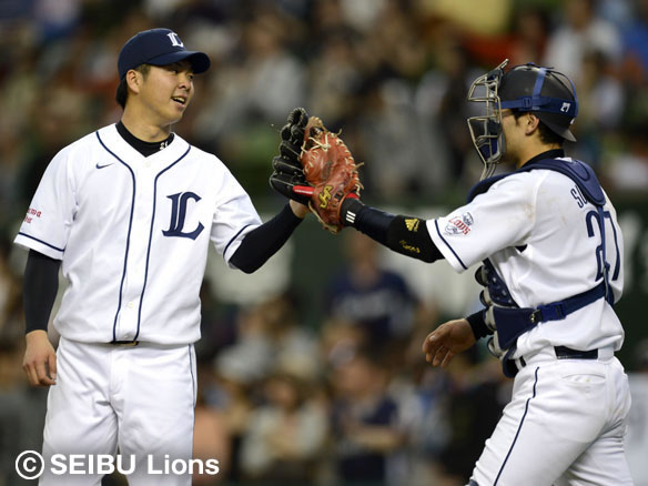 完封勝利を収めた十亀は炭谷と笑顔でグラブタッチ!