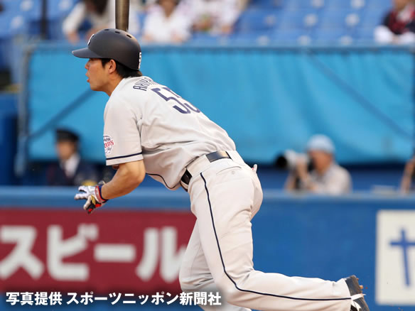 5番 岩村 中安 センターへのヒットで出塁 1塁  |