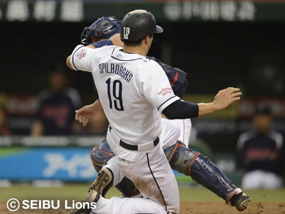 6番 スピリー 四球 内角のフォークボールを見送りフォアボールを選ぶ 1塁 |