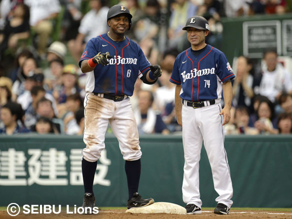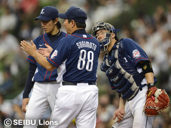 投手 大嶺祐 1番 ヘルマン 四球 一度もバットを振ることなくストレートのフォアボールを選ぶ 1塁 |